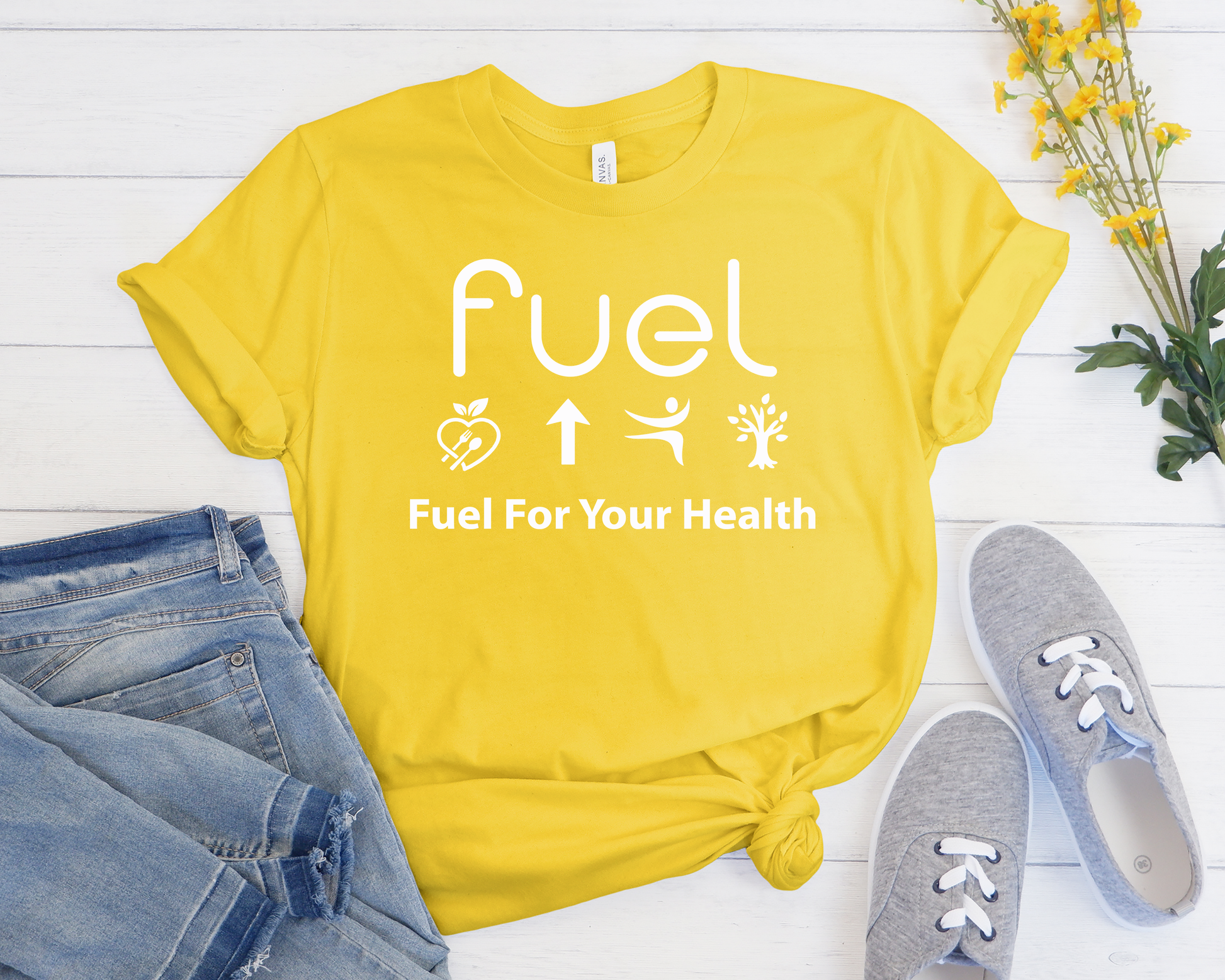 This is shown in the color Yellow. The shirts are Gildan softstyle and are a Unisex fit in a cotton/polyester blend.